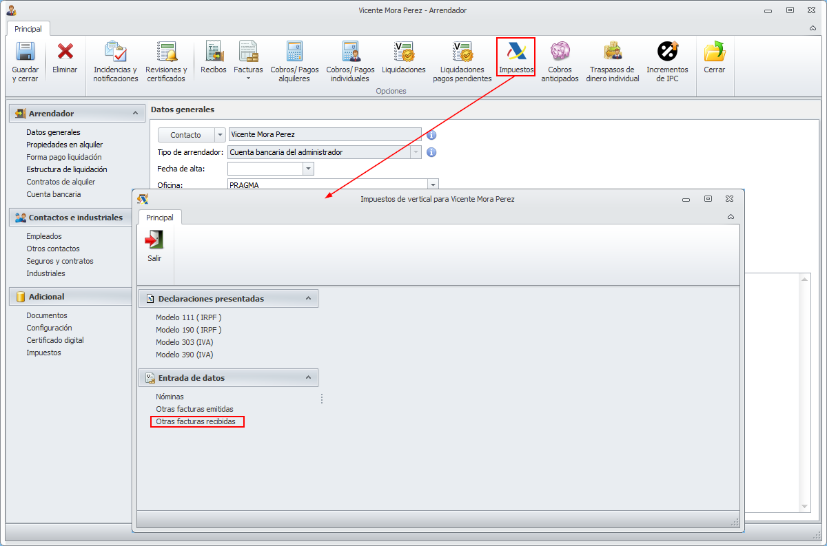 Si el arrendador gestiona el pago de algunas facturas por su propia cuenta o a través de otro administrador y éstas deben ser incluidas en las declaraciones de IVA o de IRPF, deberá introducir estas facturas en la sección Otras facturas recibidas del botón Impuestos de la ficha del arrendador.