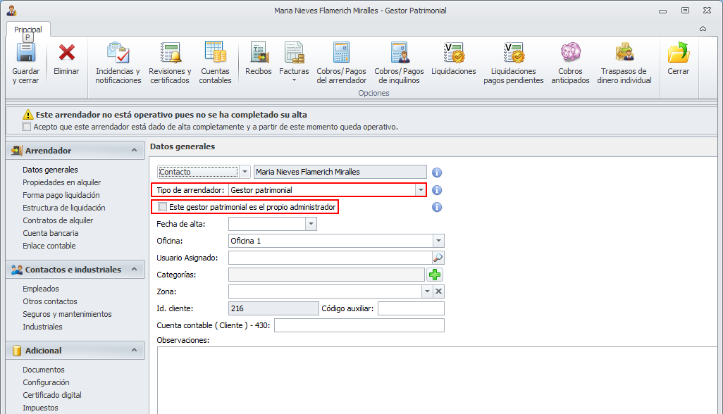 En la siguiente imagen puede ver la casilla que identifica que el arrendador se trata como Gestor patrimonial. Al activarla, se adapta la ficha a las características de este tipo de arrendador.