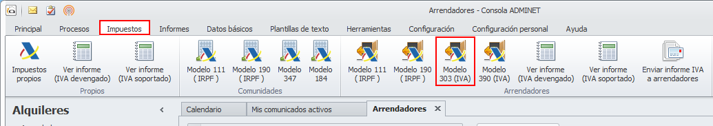 Para procesar los modelos 303 de los arrendadores, vaya al menú Impuestos y haga clic en el botón Modelo 303 del grupo Arrendadores.