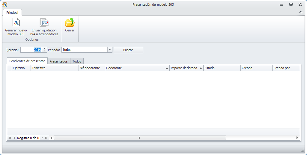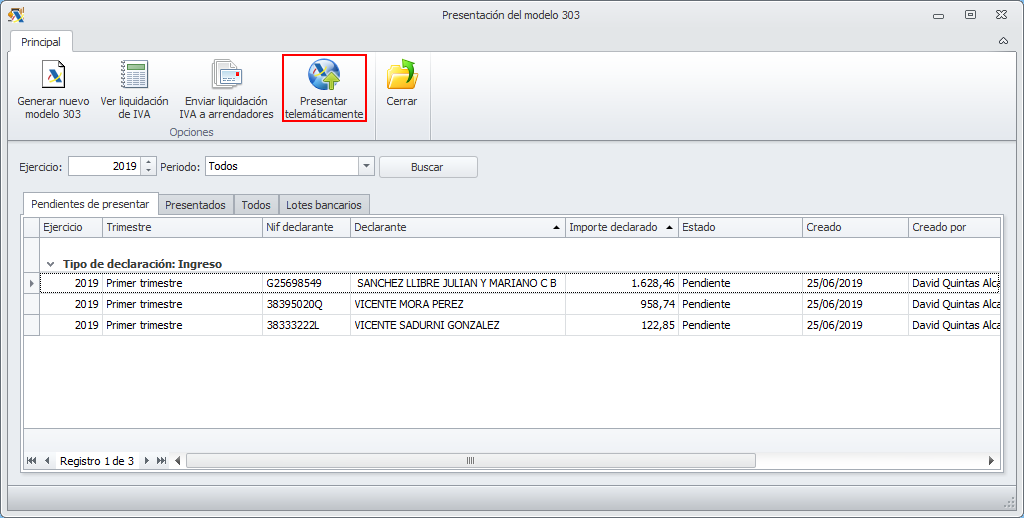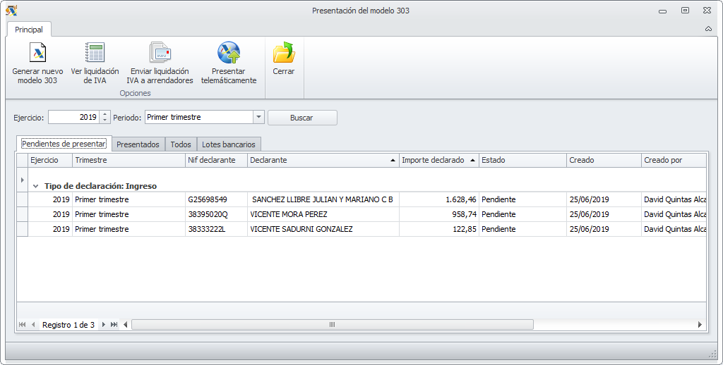 Inicialmente se muestran las pestañas Pendientes de presentar, Presentados y Todos, donde se irán guardando las declaraciones que se vayan preparando y procesando. A medida que vaya trabajando, puede ser que también se añadan otras pestañas como Exonerados y Lotes bancarios) . La pestaña Lotes bancarios será visible o no, dependiendo de si está activado el envío por lotes.