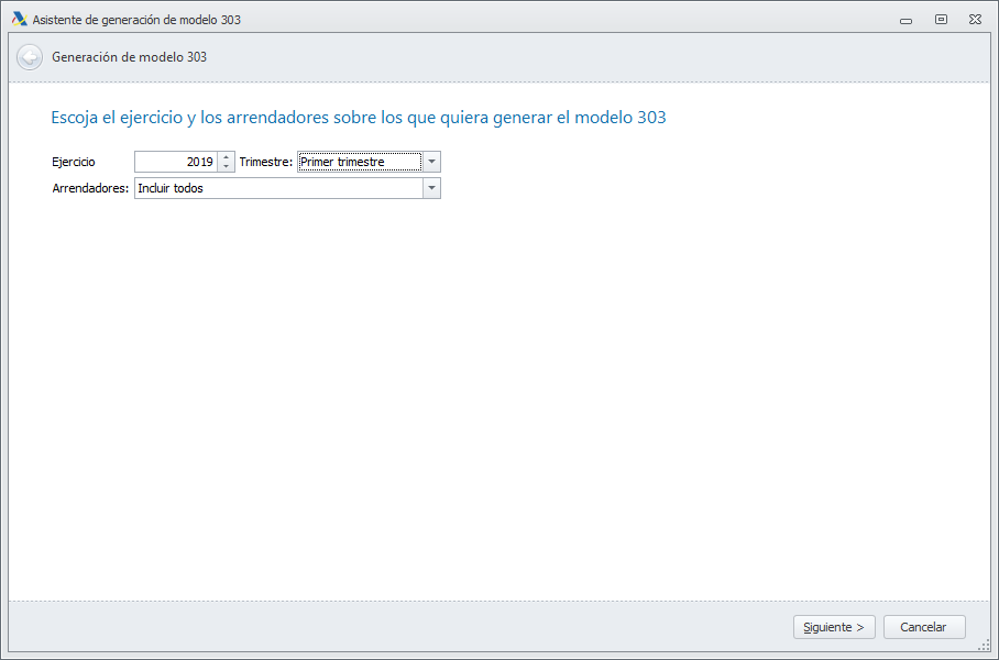 El botón Generar nuevo modelo 303 abre un asistente en el que puede escoger el periodo y los arrendadores a procesar.