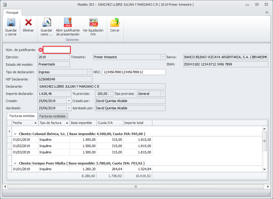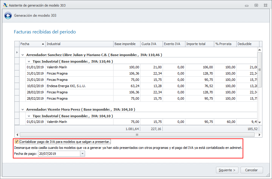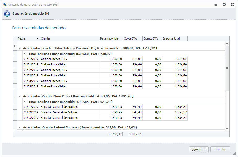 Se agrupan y suman las cuotas devengadas y deducidas, incluidas en el modelo 303 según la hoja de liquidación a la que están asignadas. Se genera un pago o cobro (dependiendo del signo positivo o negativo) en cada hoja de liquidación (marcado como realizado en cuenta del arrendador) por la diferencia entre el IVA repercutido y deducible de sus facturas. La contrapartida es el movimiento bancario (en cuenta del arrendador) de pago del modelo 303.