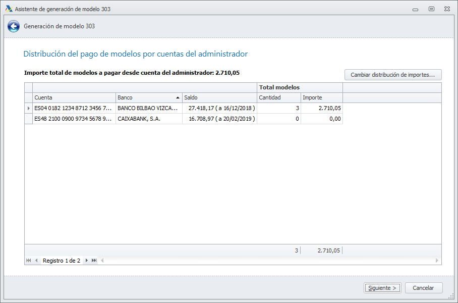 Únicamente en el caso de que los arrendadores implicados tengan configurada en su ficha más de una cuenta bancaria del administrador, se mostrará la siguiente ventana, que permitirá cambiar la distribución de importes. Si todos los arrendadores implicados tienen configurada la misma cuenta bancaria del administrador, esta ventana no se mostrará. Haga clic aquí para obtener más información sobre la distribución de importes.