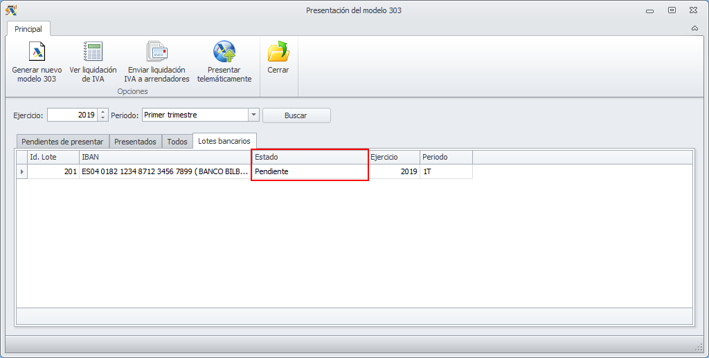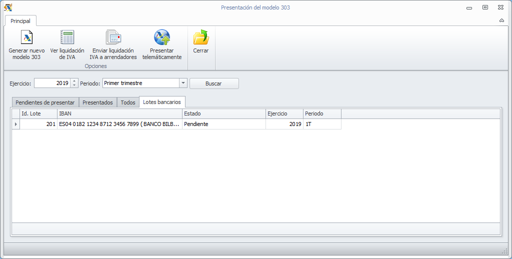 Para realizar la presentación por lotes se debe acceder a la pestaña Lotes bancarios de la ficha del modelo 303.