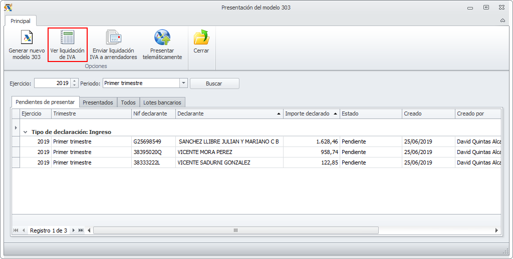 Las declaraciones generadas quedan en las pestañas Pendientes de presentar, tanto si forman parte de un lote como si no.