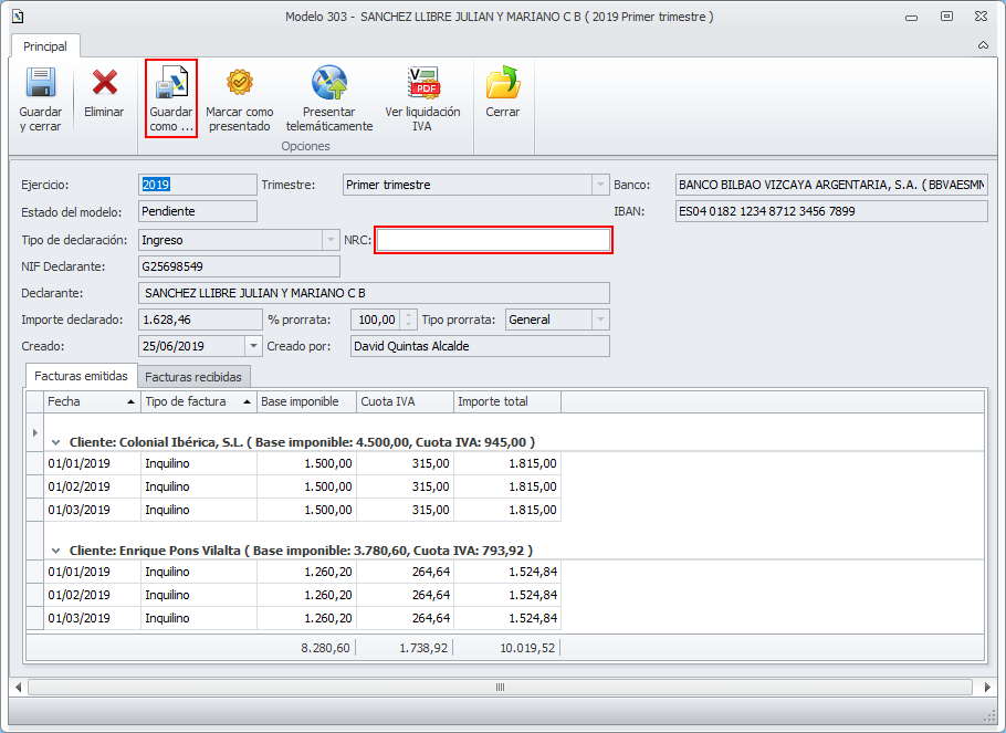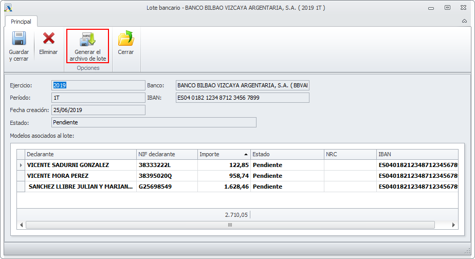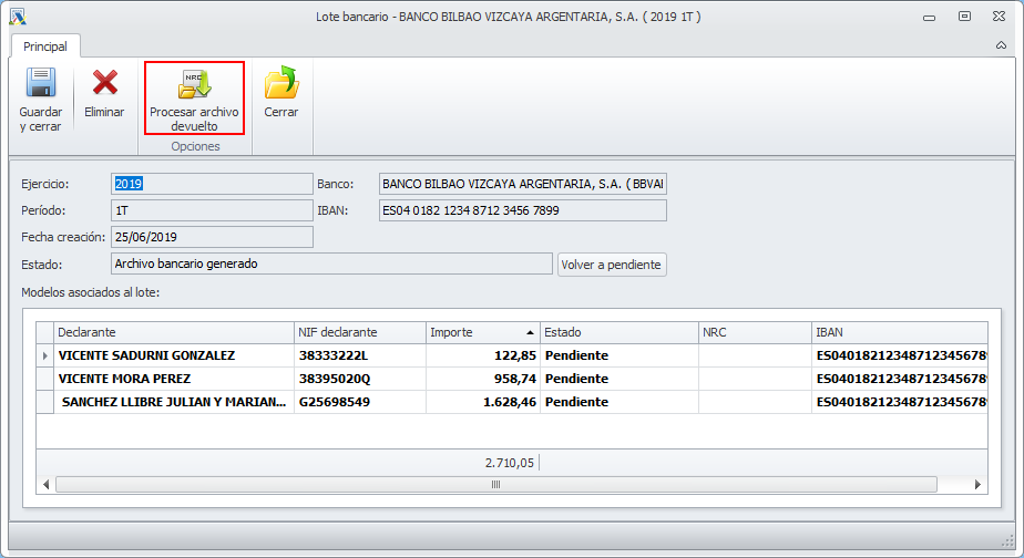NRC asignados. Se ha procesado el archivo devuelto por la entidad bancaria y se ha asignado el NRC a cada declaración.