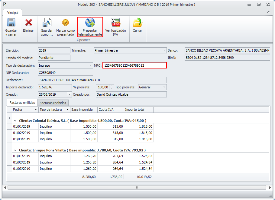 Si la forma de pago de la declaración es Adeudo en cuenta y la declaración tiene el NRC devuelto por la entidad bancaria, el modelo es enviado directamente a la Agencia Tributaria, descargándose y guardándose el comprobante de presentación. Si no tiene el NRC no se envía, ya que está pendiente de aceptación por parte del banco.