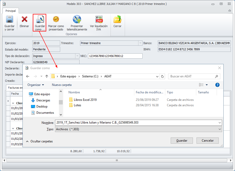 Desde la opción Guardar como se genera el fichero para presentar a la AEAT. Se debe guardar en algún lugar del ordenador (por ejemplo C:\AEAT) para luego enviarlo a la Agencia Tributaria.