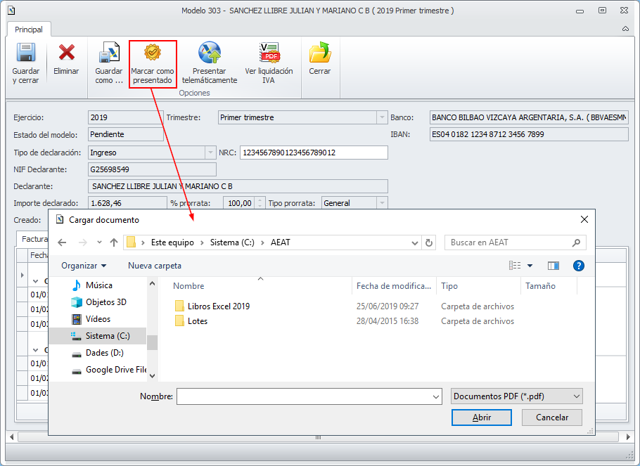 En el caso de que la declaración no se presente con adminet, tras la presentación debe entrarse en la declaración y hacer clic en el botón Marcar como presentado. Le solicita que cargue el fichero pdf de la declaración presentada.