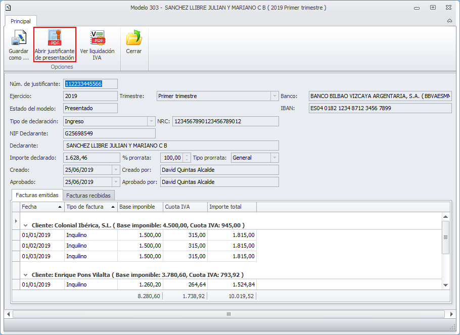 Abrir justificante de presentación muestra el documento pdf retornado por la AEAT.