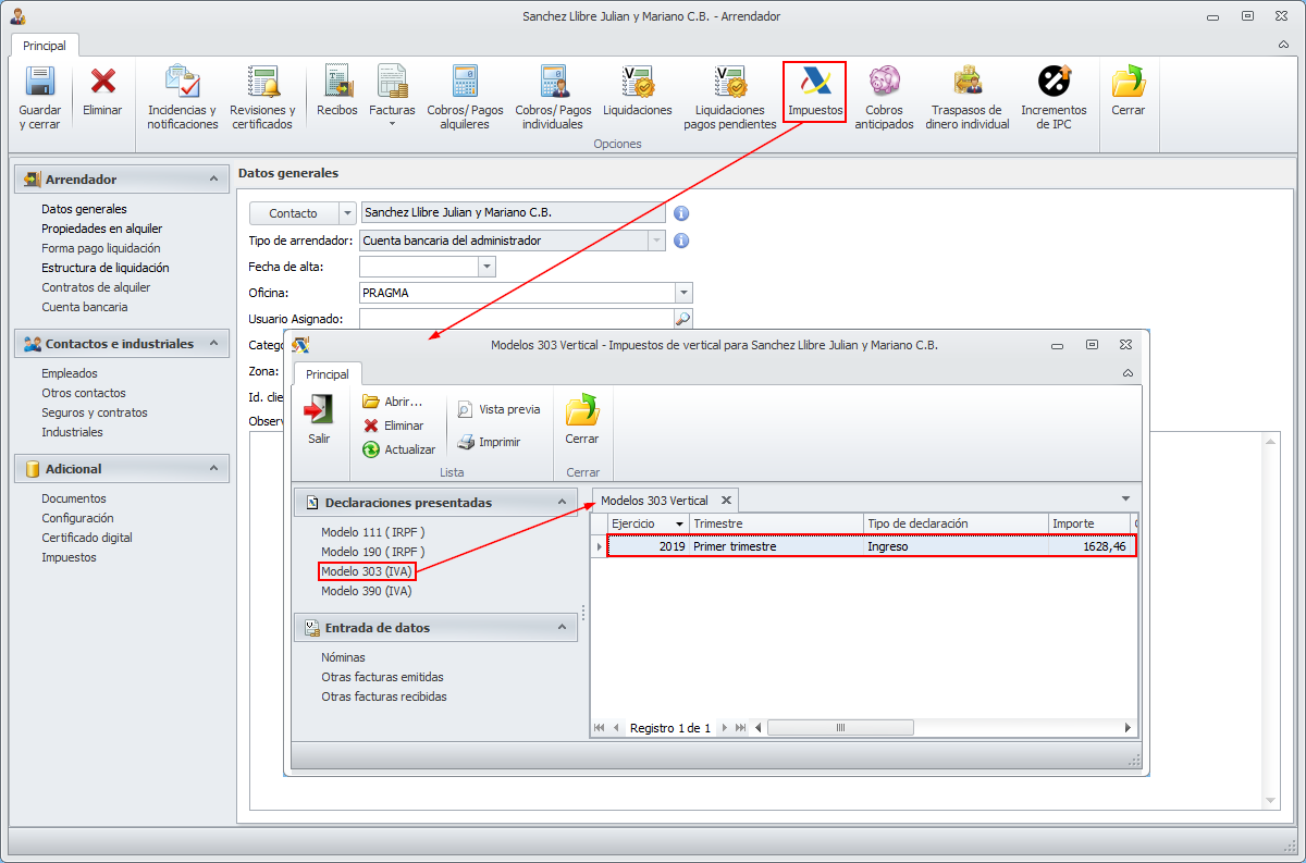 En la ficha del arrendador, desde el botón Impuestos se pueden consultar también las declaraciones presentadas de todos los modelos.