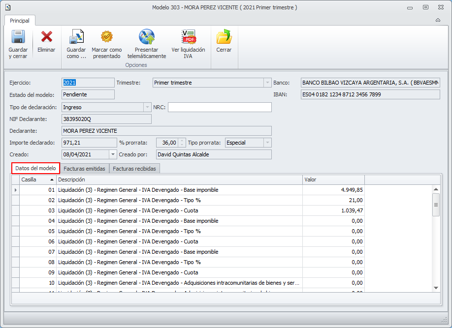En los modelos del ejercicio 2021 y posteriores, se añade una pestaña de datos con los valores de las casillas declaradas en el modelo.