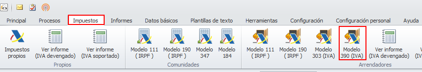 Para procesar los modelos 390 de los arrendadores, vaya al menú Impuestos y haga clic en el botón Modelo 390 del grupo Arrendadores.