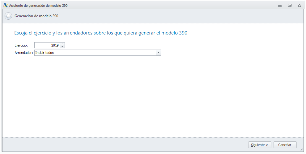 El botón Generar nuevo modelo 390 abre un asistente en el que puede escoger el ejercicio y los arrendadores a procesar.