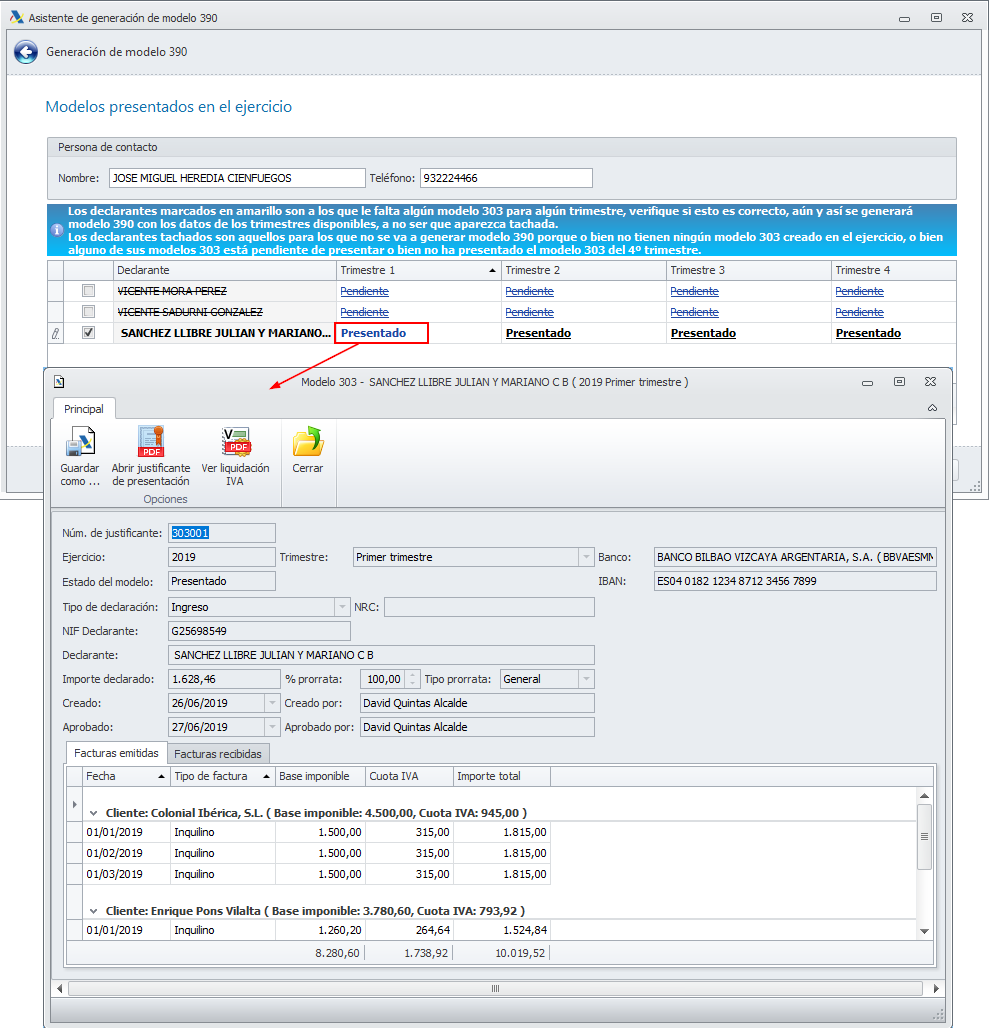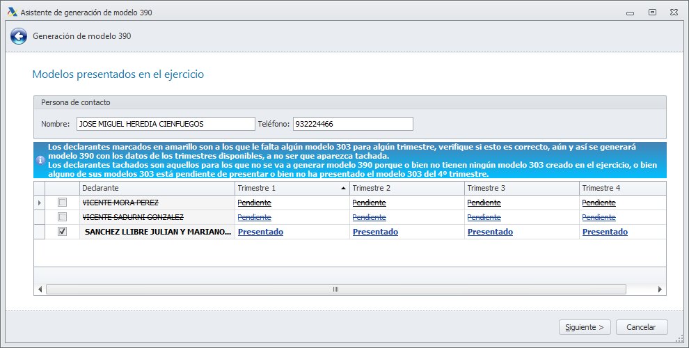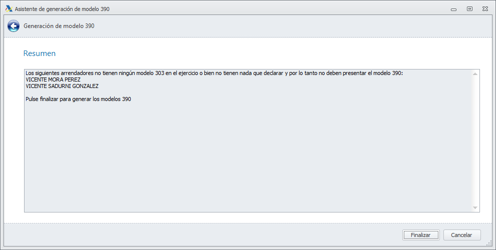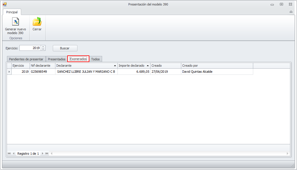 Al hacer clic en Finalizar, termina el proceso y se muestra la ventana del modelo 390 con las declaraciones preparadas. Aquellos que están exonerados de presentar este modelo se muestran en la pestaña Exonerados.