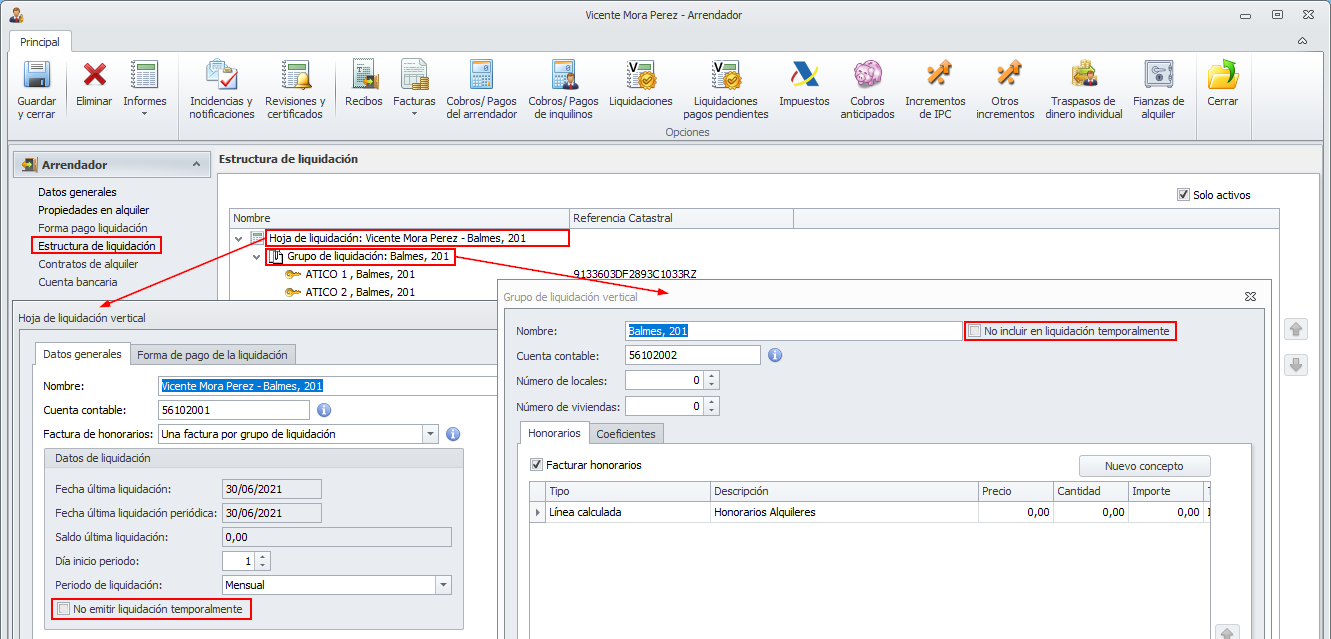 Debe marcar la casilla No incluir en liquidación temporalmente en el grupo de liquidación, cuando sea únicamente ese grupo el que no se desea liquidar. Sería el caso en que una hoja tenga varios grupos de liquidación, que los departamentos de uno de ellos hayan quedado desocupados y que no se desee mostrar ese grupo en la liquidación mientras no tenga alquileres. Si activa esta casilla en uno de los grupos, la liquidación se seguirá emitiendo con el resto de grupos de liquidación.