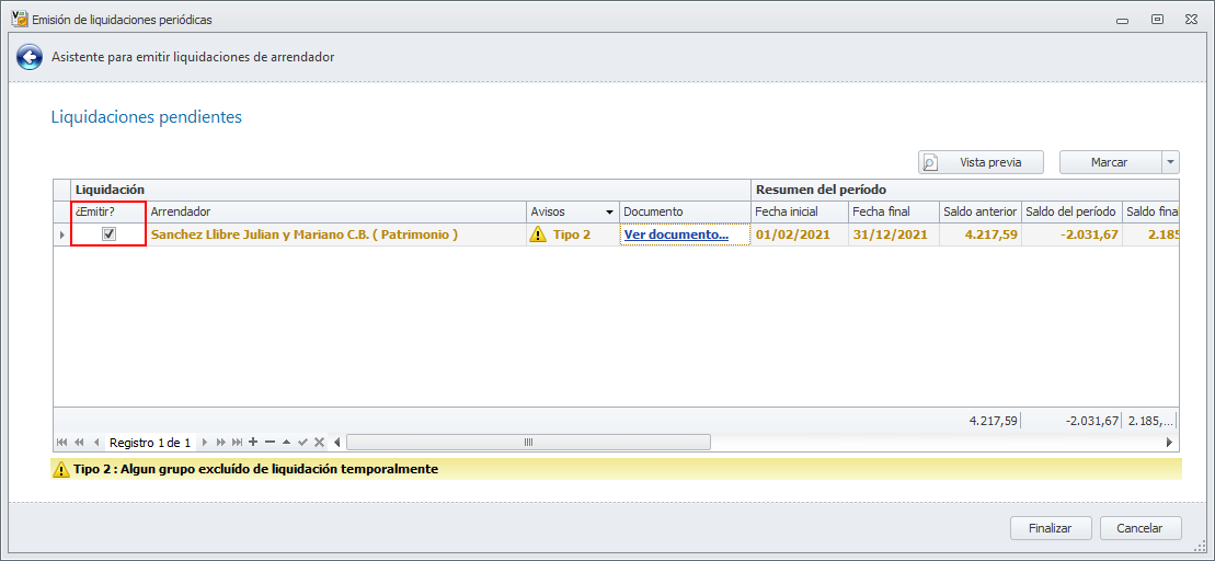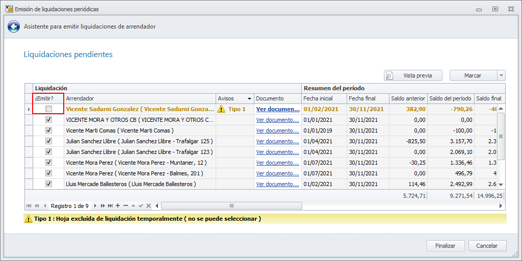Al emitir las liquidaciones, aquellas hojas que están marcadas como No emitir liquidación temporalmente son calculadas y mostradas con un aviso, no permitiéndose su emisión.