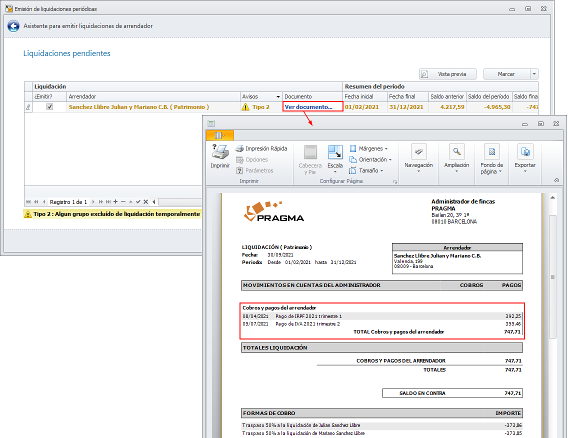Adminet contempla la posibilidad de marcar una liquidación de arrendador o perceptor para que no se emita.
