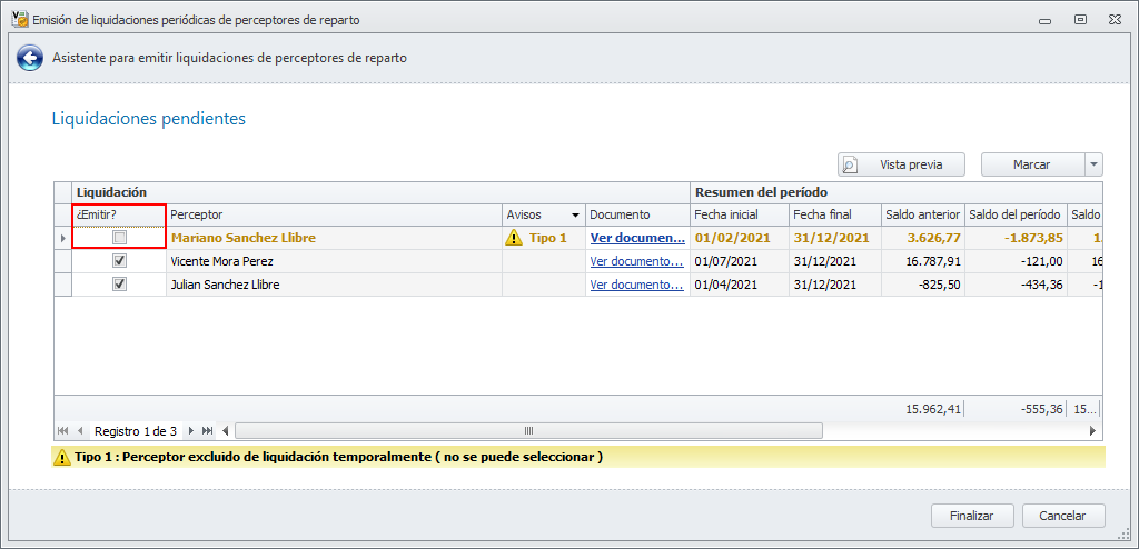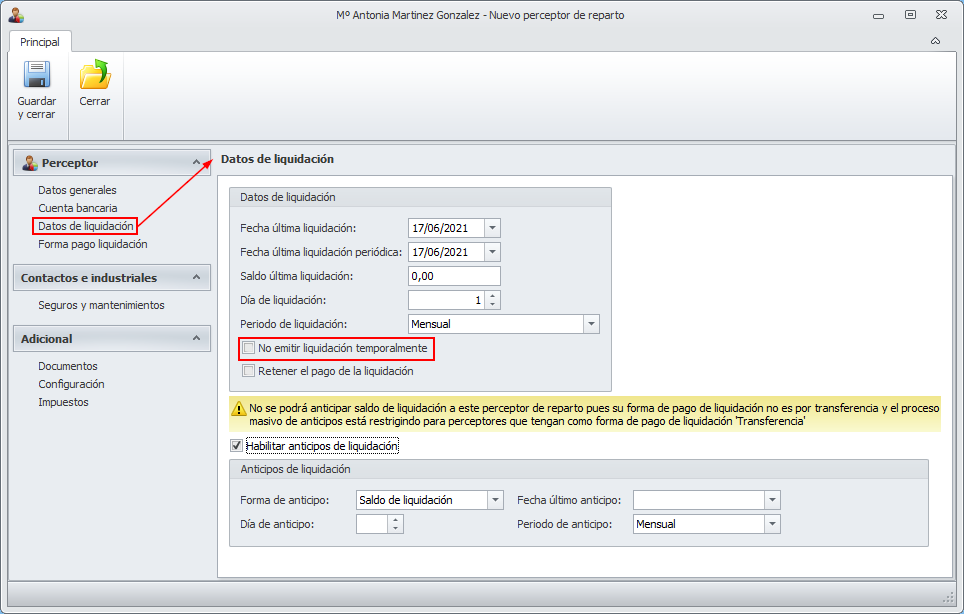 En las liquidaciones de perceptor, las de aquellos que están marcados como No emitir liquidación temporalmente son calculadas y mostradas con un aviso, no permitiéndose su emisión.