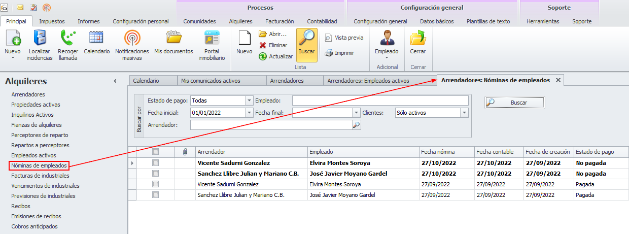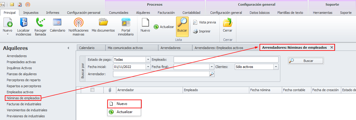 La vista Nóminas de empleados muestra los registros de nómina generados desde adminet para su pago a los empleados de los arrendadores. La ventana tiene el siguiente aspecto.