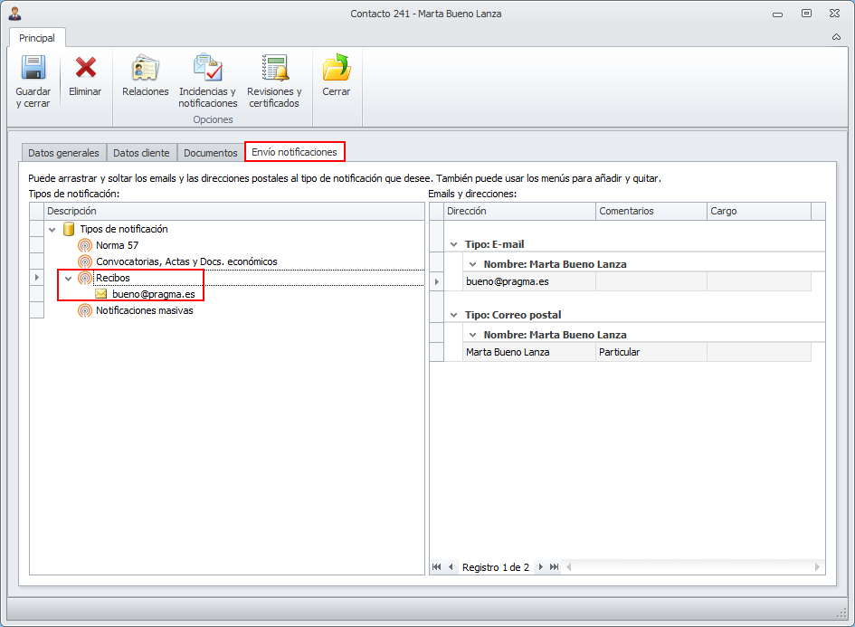 Para determinar la forma de envío de la notificación al inquilino se busca, en la pestaña Envío notificaciones de la ficha de contacto del inquilino principal, la forma escogida para el tipo Recibos. En la siguiente imagen puede ver que se enviará por correo electrónico a la cuenta bueno@pragma.es.
