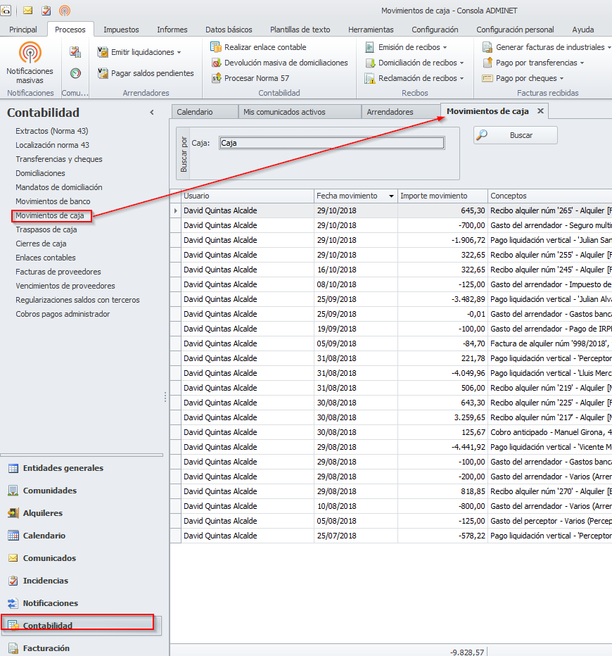 El pago por caja de los saldos de las liquidaciones de arrendadores y perceptores de reparto, se inicia accediendo al apartado Contabilidad y haciendo clic sobre la opción Movimientos de caja.