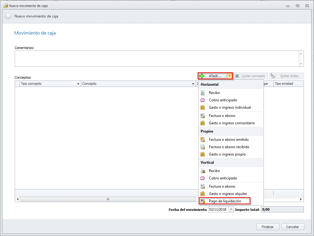 Haga clic derecho sobre la lista de movimientos para añadir uno nuevo. Al acceder a la ventana dónde identifica el tipo de movimiento, escoja Pago de liquidación del apartado Vertical.