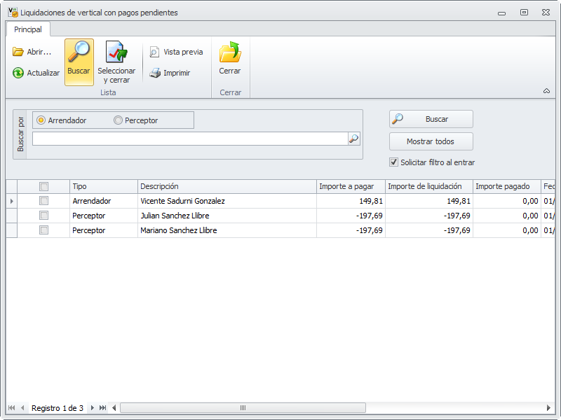 Se abrirá una ventana que le mostrará todos los saldos pendientes, para que escoja cuáles desea pagar o cobrar. Los saldos a favor del administrador se mostrarán en negativo y se permitirá efectuar el cobro de los mismos.