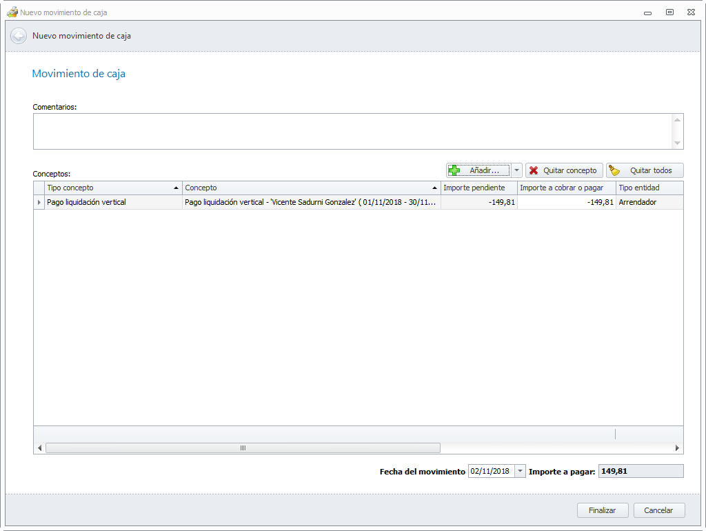 Una vez seleccionados, se añaden a los conceptos que componen el movimiento de caja.