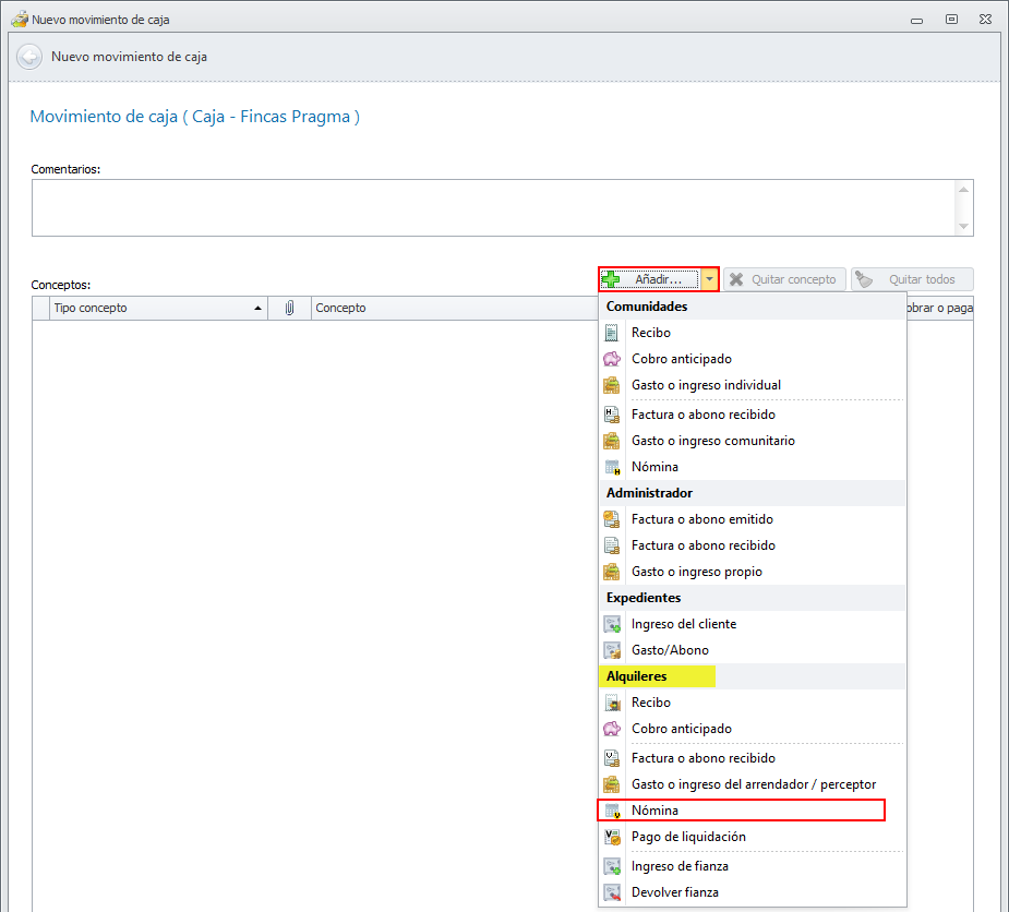 Al registrar un movimiento de caja, entre las opciones del apartado Alquileres se tiene disponible la opción Nómina.