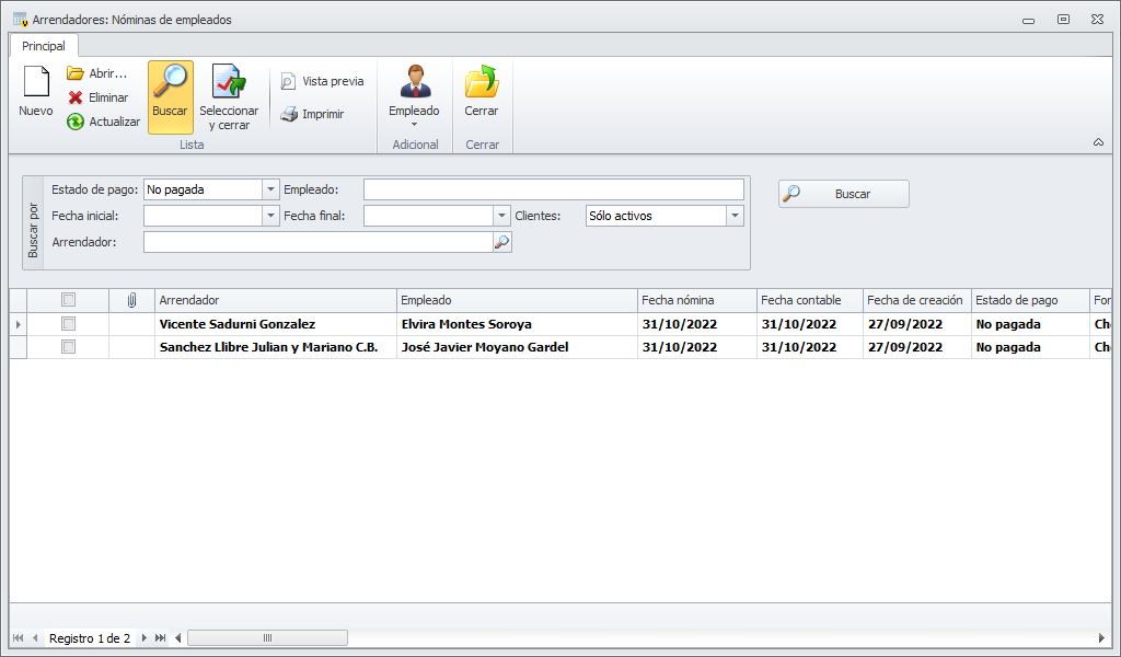 Al escoger esta opción, se muestran los registros de nóminas de empleados de alquileres pendientes de pagar para que el usuario escoja la que va a pagar.