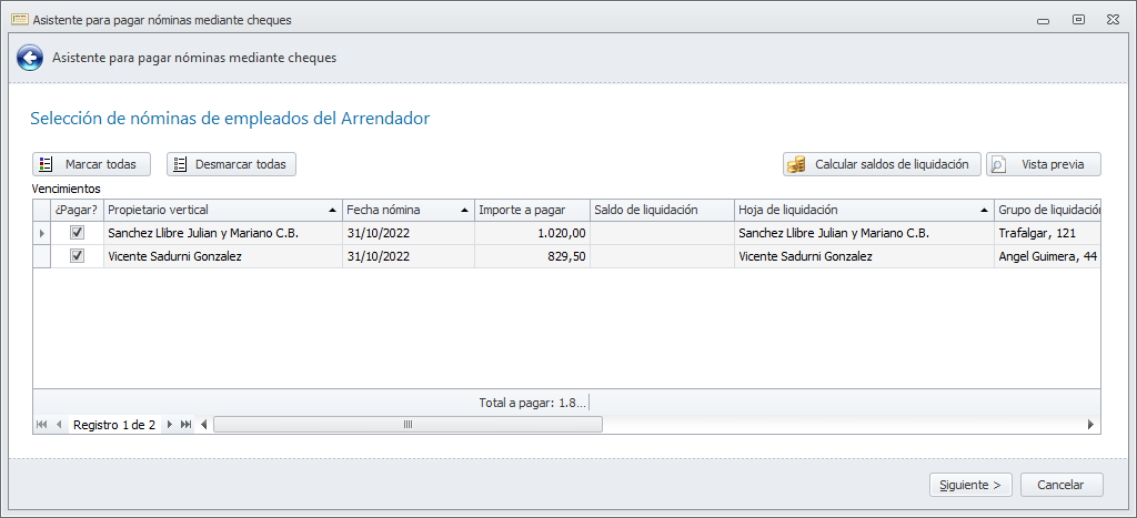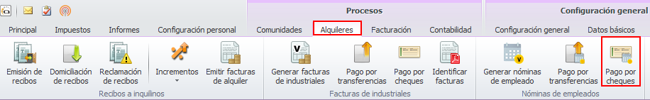 Se accede mediante el botón Pago por cheques del apartado Nóminas de empleados que se puede encontrar en el menú Procesos/Alquileres.