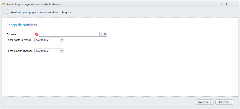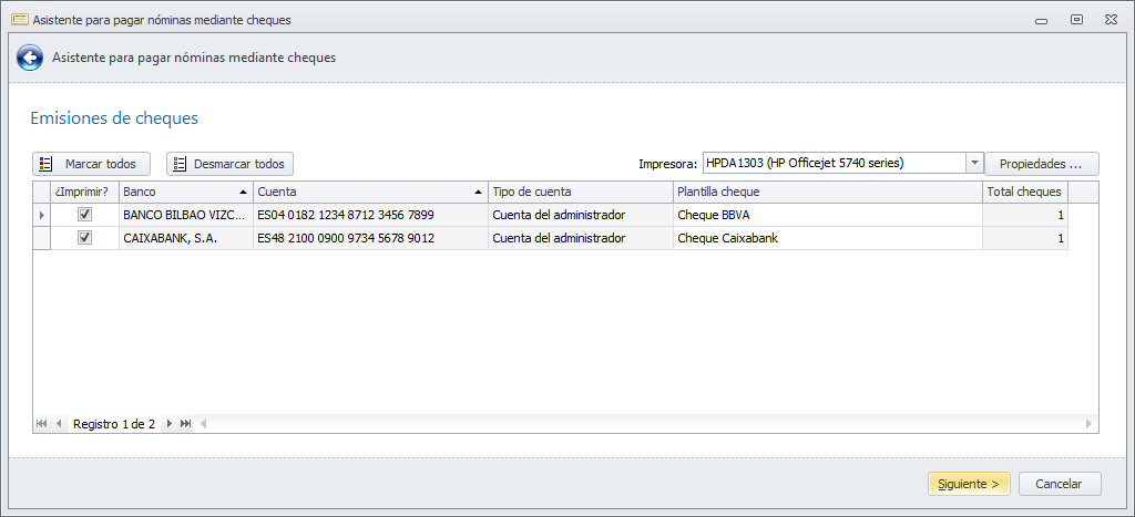 Se abre un asistente que le guiará durante el proceso. Escoja la cuenta bancaria desde la que emitirá los cheques y la fecha de emisión, que será también la de contabilización del pago.