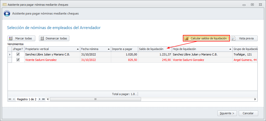 Si, para alguna nómina, el importe a pagar es superior al saldo de la liquidación, se muestra la línea en color rojo para advertir al usuario.