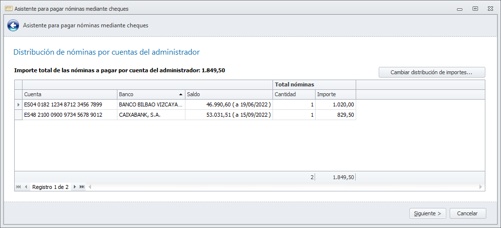 Sólo en el caso de que el administrador disponga de más de una cuenta bancaria, se mostrará esta ventana en la que permitirá repartir el pago entre ellas. Haga clic aquí para ver cómo funciona el botón Cambiar distribución de importes.