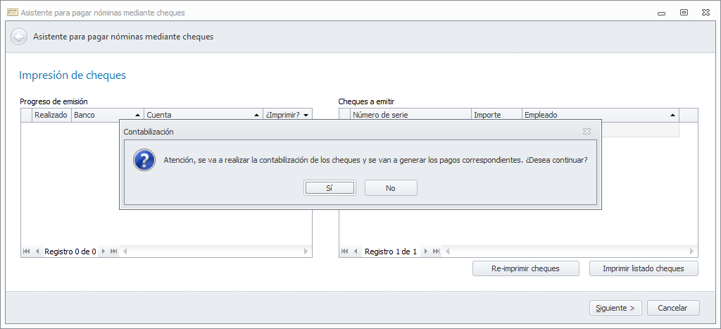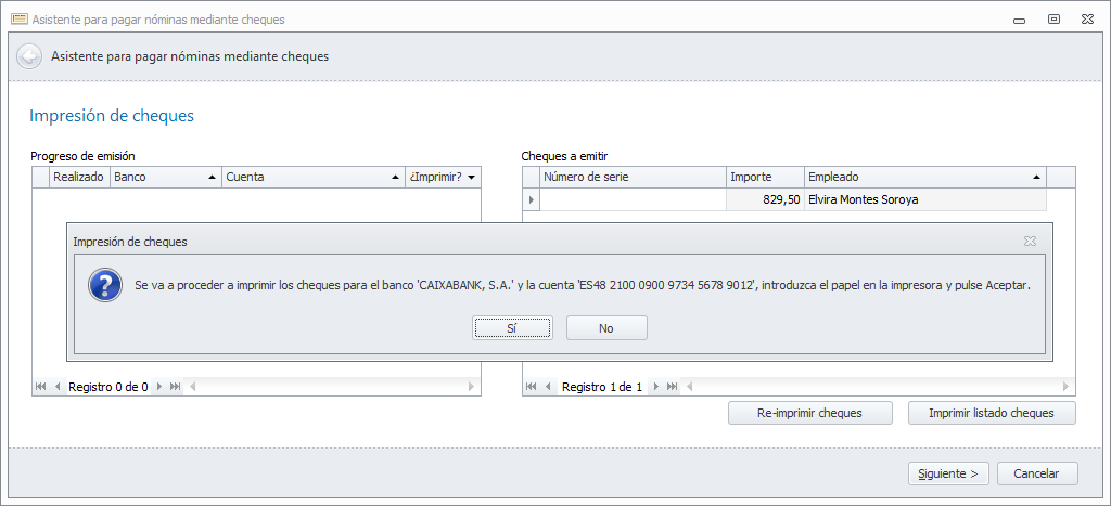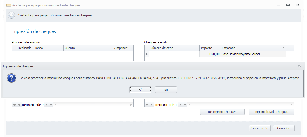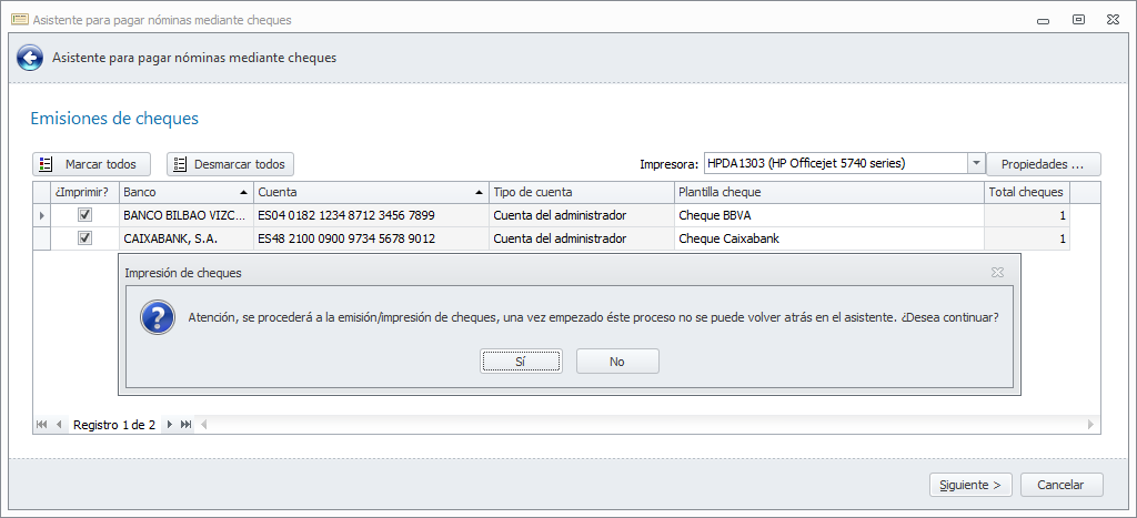A continuación, muestra un mensaje para que confirme que tiene el papel de cheques puesto en al impresora para la primera de las cuentas bancarias. Al contestar Sí, se inicia la impresión.