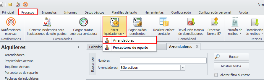 Para emitir las liquidaciones de los arrendadores, deberá acceder al menú Procesos, hacer clic en el botón Emitir liquidaciones y escoger Arrendadores.