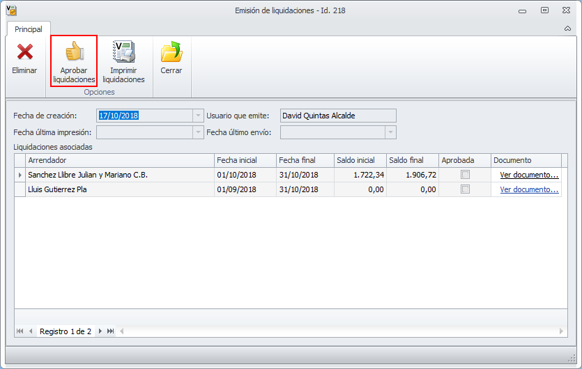 Debe proceder a su revisión y a aprobarlas o a eliminarlas. Haga clic aquí para ver cómo trabajar con la ficha de la emisión de liquidaciones.