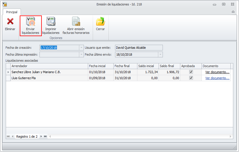 Cuando finaliza el asistente de emisión de liquidaciones, queda abierta la ficha de la emisión.