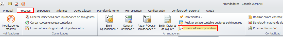 El envío de informes periódico se encuentra en el menú Procesos.