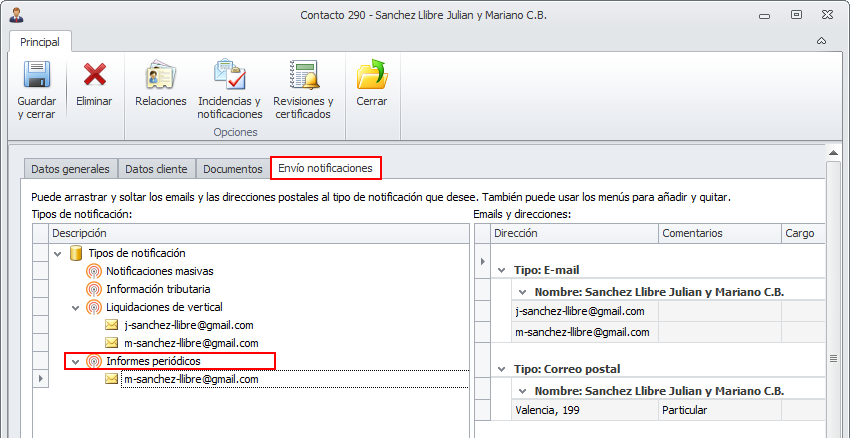 Los informes son remitidos a la dirección especificada en el tipo Informes periódicos de la pestaña Envío notificaciones de la ficha del contacto.