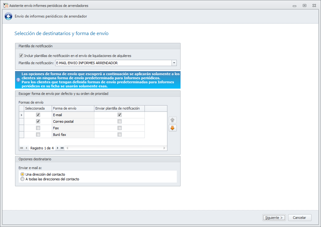 En caso de no tener ninguna dirección indicada aquí se enviará según la preferencia y configuración establecidas en la ventana de Selección de destinatarios y forma de envío del asistente.