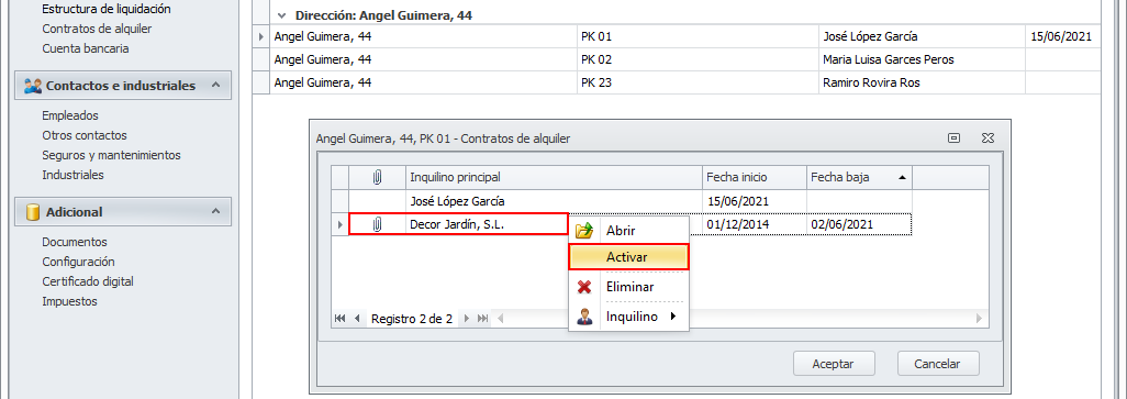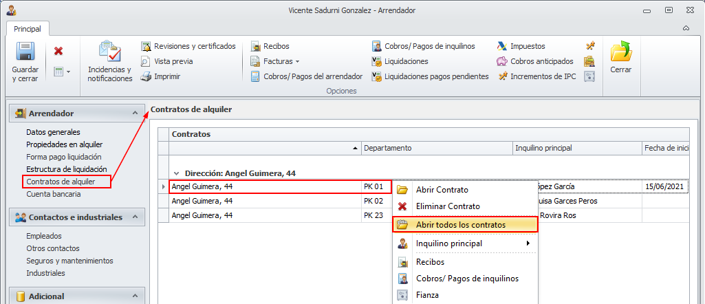 Si necesita reactivar un contrato de alquiler, vaya a la ficha del arrendador y sitúese en Contratos de alquiler. Haga clic derecho sobre el departamento a consultar y escoja Abrir todos los contratos.