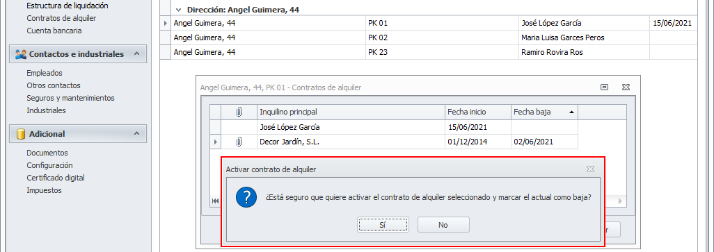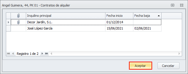 Se abre una ventana que muestra el histórico de contratos de ese departamento y en el que puede ver el nombre del inquilino principal, y las fechas de alta y baja. Evidentemente, el contrato que se encuentre activo se mostrará sin fecha de baja.