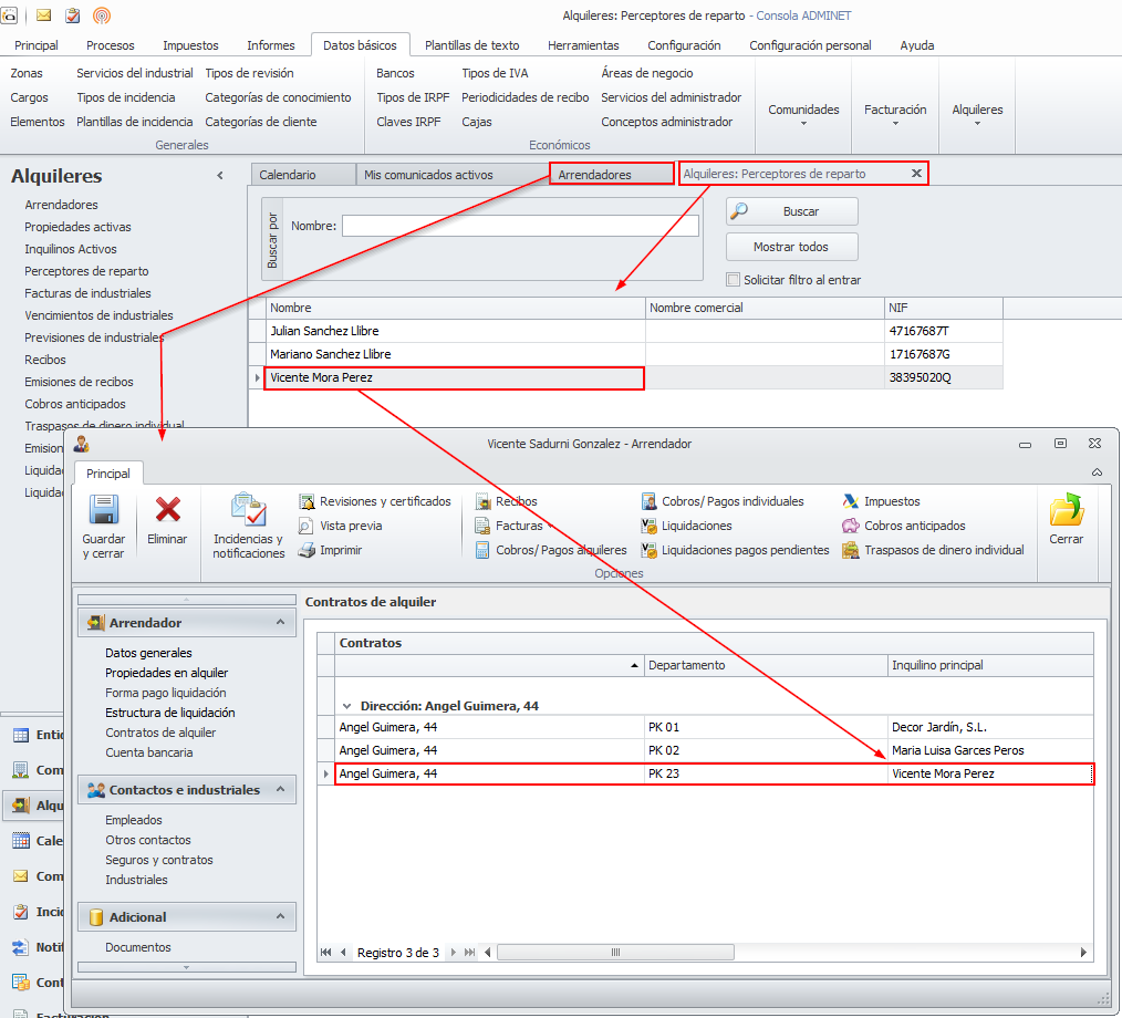 El ejemplo más claro es el de un arrendador que es inquilino en una vivienda, local o parking que pertenece a otro arrendador que también es administrado por el administrador. Los recibos de alquiler del inquilino se le cargarán como gasto en su liquidación de reparto.