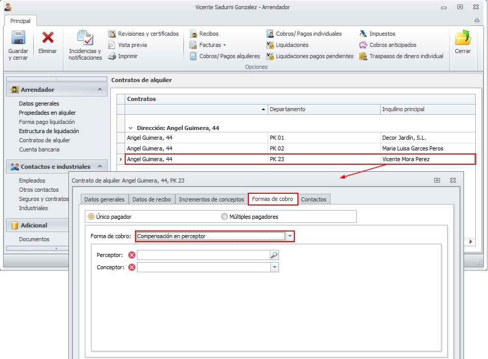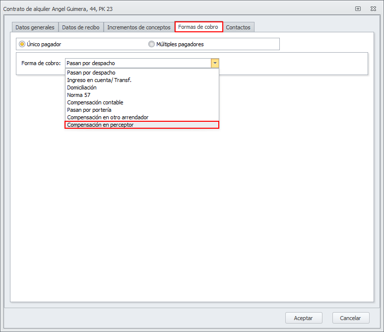 La forma de cobro Compensación en perceptor se puede escoger en la pestaña Formas de cobro de la ficha del contrato de alquiler.