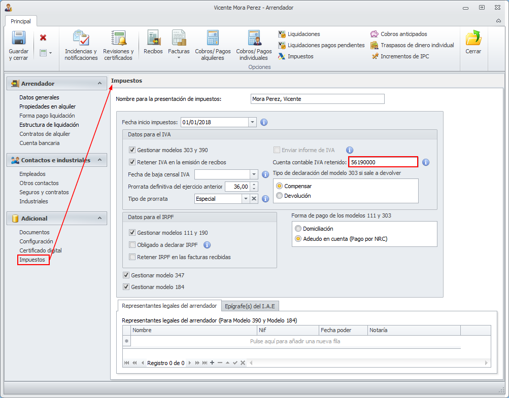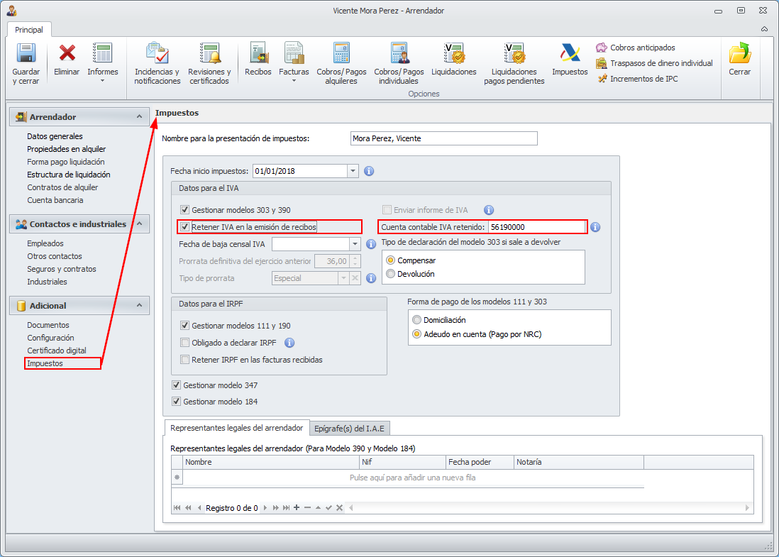 La retención del IVA de las facturas de alquiler es configurable a nivel de arrendador. Eso quiere decir que se puede aplicar la retención a un arrendador y a otro no. Para indiciar que a un arrendador se le desea realizar la retención del IVA, debe accederse a la sección Impuestos de su ficha.