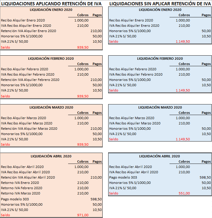 Veamos dos ejemplos de liquidación de alquileres aplicando o no la retención del IVA. Como puede ver, en las liquidaciones de la parte izquierda, en la que se practica la retención del IVA, los saldos de cada mes son más homogéneos, mientras que en las de la parte derecha (donde no se aplica retención del IVA) el mes en que se paga el IVA el saldo es muy inferior (551€ contra 1149,50€).