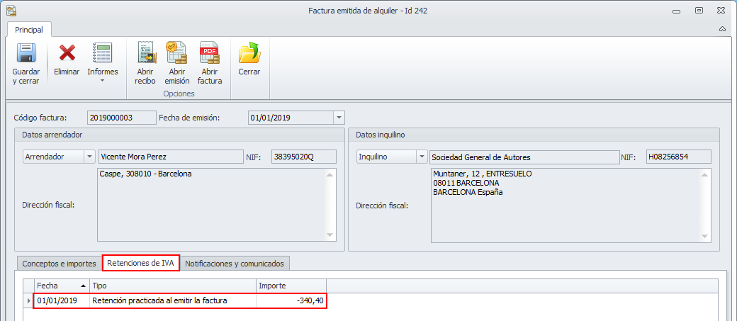 Se han modificado las fichas de la factura de alquiler para incorporar una pestaña que muestre las retenciones de IVA aplicadas.