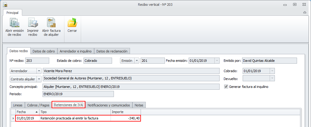 Se ha modificado la ficha del recibo de alquiler para incorporar una pestaña que muestre las retenciones de IVA aplicadas.